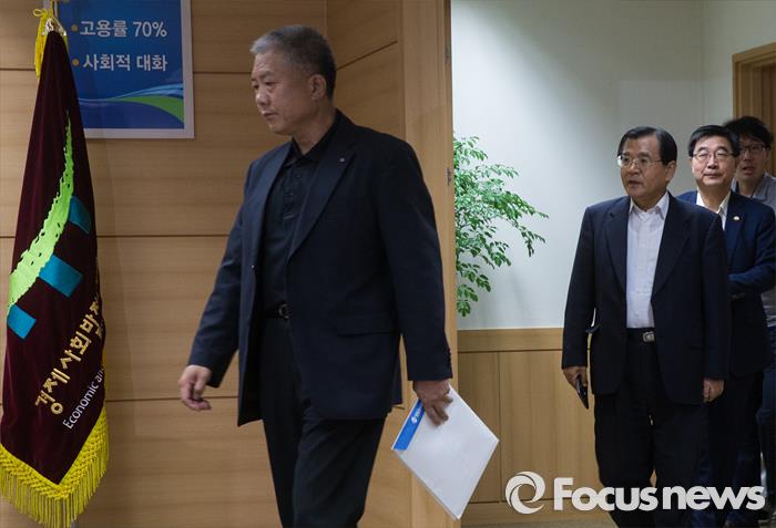 대단히 감사합니다.(서울=포커스뉴스) 13일 오후 서울 세종로 정부서울청사 내 노사정 대회의실에서 열린 4인 대표자 회의에 김동만(왼쪽부터) 한국노총 위원장, 김대환 노사정위원장,이기권 고용노동부 장관이 입장하고 있다.