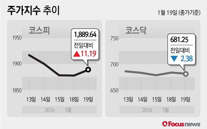 (서울=포커스뉴스) 19일 코스피지수는 전날 보다 0.60%(11.19포인트) 오른 1889.64에 장을 마쳤다. 코스닥지수는 전일 대비 0.35%(2.38포인트) 내린 681.25에 마감했다.