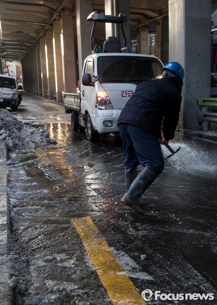 (서울=포커스뉴스) 19일 오후 서울 광진구 동부지방법원 앞 상수관이 노후로 파열돼 인근 도로가 결빙돼 있다.