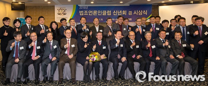 (서울=포커스뉴스) 19일 오후 서울 중구 프레스센터에서 열린 2016년 법조언론인클럽 신년회 겸 시상식에서 류희림 법조언론인클럽 회장을 비롯한 참석자들이 기념촬영을 갖고 있다.