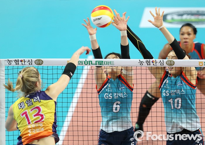 (서울=포커스뉴스) 19일 장충체육관에서 열린 '2015-2016NH농협 V-리그' 여자부 GS칼텍스-흥국생명 경기에서 흥국생명 테일러가 GS칼텍스 이나연, 배유나의 블로킹에 스파이크를 때리고 있다.