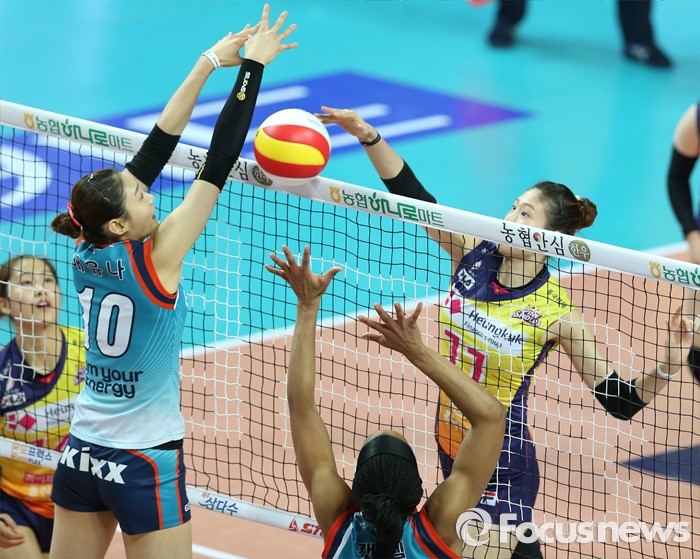 (서울=포커스뉴스) 19일 장충체육관에서 열린 '2015-2016NH농협 V-리그' 여자부 GS칼텍스-흥국생명 경기에서 흥국생명 김수지가 GS칼텍스 배유나의 블로킹을 피해 연타 공격을 하고 있다.