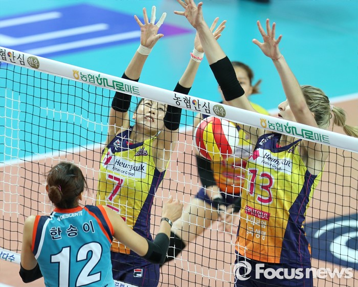 (서울=포커스뉴스) 19일 장충체육관에서 열린 '2015-2016NH농협 V-리그' 여자부 GS칼텍스-흥국생명 경기에서 GS칼텍스 한송이가 연타 공격으로 흥국생명 김혜진, 테일러의 블로킹을 무력화 시키고 있다.