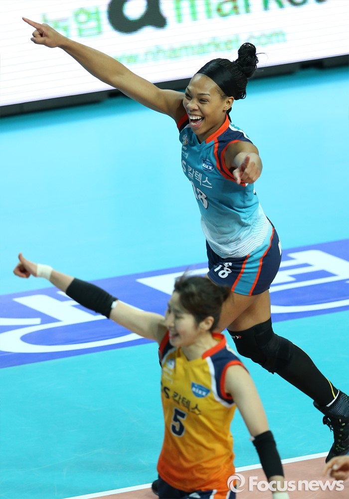 (서울=포커스뉴스) 19일 장충체육관에서 열린 '2015-2016NH농협 V-리그' 여자부 GS칼텍스-흥국생명 경기에서 GS칼텍스 캣벨이 스파이크를 성공시키고 환호하고 있다.