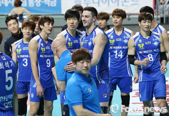 (서울=포커스뉴스) 19일 장충체육관에서 열린 '2015-2016NH농협 V-리그' 남자부 우리카드-대한항공 경기에서 우리카드를 물리치고 선두로 나선 대한항공 선수들이 경기를 마치고 밝은 표정을 짓고 있다.