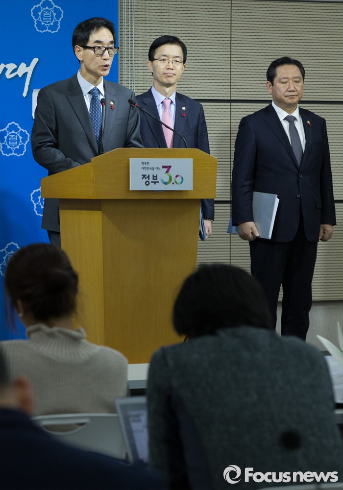(세종=포커스뉴스) 이준식 사회부총리 겸 교육부장관이 19일 오전 세종시 정부세종청사 교육부 공용브리핑룸에서 국민행복분야 정부합동 업무보고 사전브리핑을 하고 있다. 왼쪽부터 이 부총리, 방문규 보건복지부 차관, 권용현 여성가족부 차관.