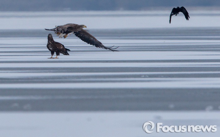 (하남=포커스뉴스) 한파주의보가 내려진 20일 오전 경기도 하남시 미사리 한강변이 모두 얼어붙은 가운데, 겨울철새 흰꼬리수리(천연기념물 243호)가 참수리가 잠시 비운 겨울왕국의 영역을 독차지하고 있다.