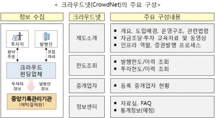 PC와 모바일 등을 통해 크라우드넷에 접속하면 관련 제도와 등록중개업자의 현황, 투자교육자료 등을 확인할 수 있으며 향후 발행·투자한도 조회, 통계자료 서비스도 제공될 예정이다.