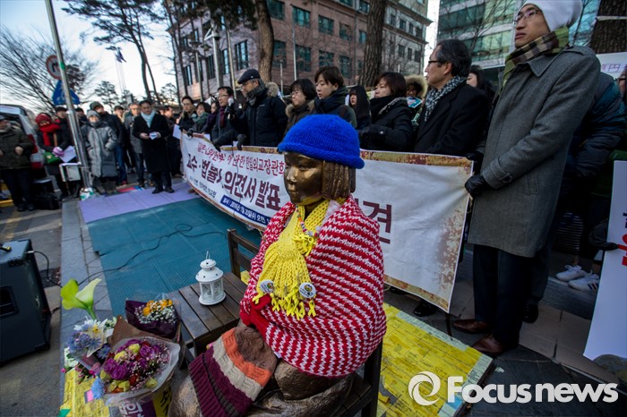 (서울=포커스뉴스) 20일 오전 서울 종로구 일본대사관 인근에서 민주사회를 위한 변호사모임 관계자들이 일본군 위안부 문제 관련 한일외교장관회담에 대한 교수, 법률가 의견서 발표 기자회견을 하고 있다.