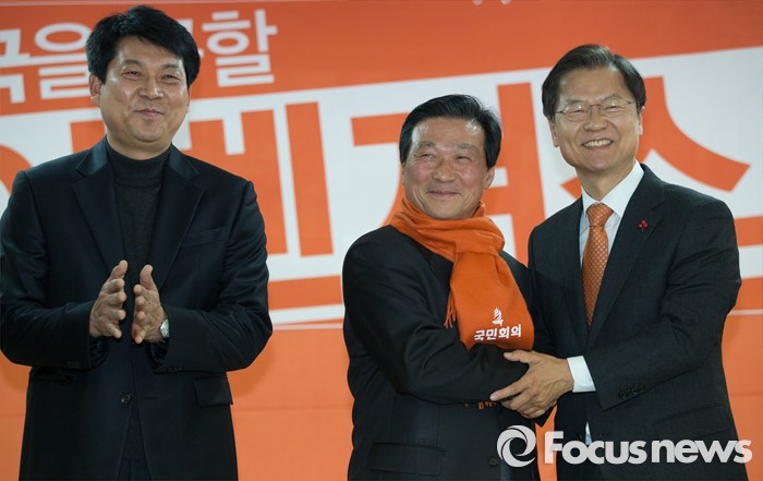 (서울=포커스뉴스) 국민회의 천정배 창당준비위원장이 20일 오후 서울 여의도 국민회의 당사에서 열린 인재 입당식에서 통일/노동 분야 5명의 인사들에게 목도리를 선물한 후 인사를 나누고 있다.
