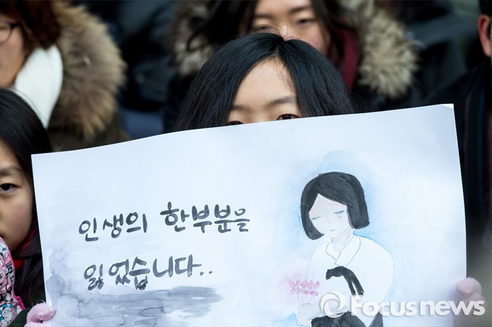 (서울=포커스뉴스) 20일 오후 서울 종로구 옛 일본대사관 앞에서 열린 제1214차 일본군 위안부 문제 해결 위한 정기수요시위에서 참가자들이 한일 위안부 합의 무효를 촉구 하고 있다. 이날 일본군 위안부 피해자 할머니들은 연이은 혹한으로 시위에 자리하지 못했다.