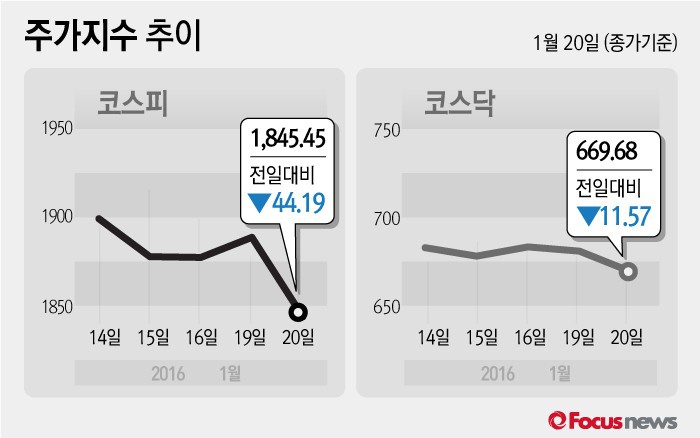 (서울=포커스뉴스) 20일 코스피지수는 전날 보다 2.34%(44.19포인트) 오른 1845.45에 장을 마쳤다. 코스닥지수는 전일 대비 1.70%(11.57포인트) 내린 669.68에 마감했다.