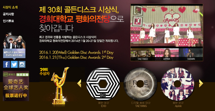 한편, 30회째를 맞는 이번 시상식은 경희대 평화의 전당에서 개최된다. 주최 측은 강추위 때문에 레드카펫 대신 내부 포토월 행사만 진행하기로 했다.20일과 21일 양일간 서울 경희대학교 평화의 전당에서 '제30회 골든디스크'가 열린다. <사진=골든디스크 공식 홈페이지 캡처>