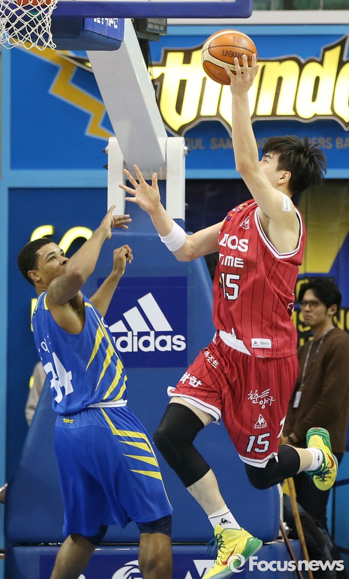 (서울=포커스뉴스) 20일 서울 잠실실내체육관에서 열린 2015-2016 프로농구 삼성-LG 경기에서 LG 김종규가 삼성 와이즈의 마크를 피하며 골밑슛을 시도하고 있다.
