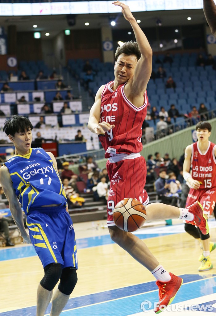 (서울=포커스뉴스) 20일 서울 잠실실내체육관에서 열린 2015-2016 프로농구 삼성-LG 경기에서 LG 김영환이 슈팅을 시도하다 삼성 이시준의 파울에 볼을 놓치고 있다.