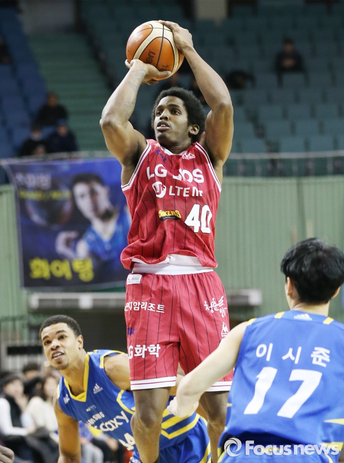 (서울=포커스뉴스) 20일 서울 잠실실내체육관에서 열린 2015-2016 프로농구 삼성-LG 경기에서 LG 샤크가 점프하며 미들슛을 시도하고 있다.