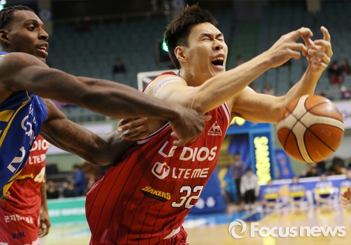 (서울=포커스뉴스) 20일 서울 잠실실내체육관에서 열린 2015-2016 프로농구 삼성-LG 경기에서 LG 류종현이 삼성 라틀리프의 파울에 볼을 놓치고 있다.