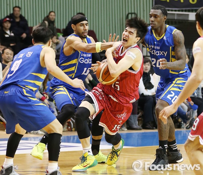 (서울=포커스뉴스) 20일 서울 잠실실내체육관에서 열린 2015-2016 프로농구 삼성-LG 경기에서 LG 김종규가 문태영, 라틀리프의 수비에 막혀 볼을 놓치고 있다.