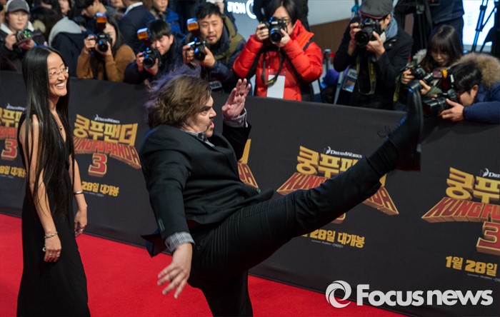 (서울=포커스뉴스) 할리우드 애니메이션 '쿵푸팬더 3' 홍보차 내한한 배우 잭 블랙과 여인영 감독이 20일 오후 서울 영등포구 타임스퀘어에서 열린 레드카펫 행사에 참석하고 있다.