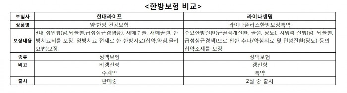 21일 보험업계에 따르면 현대라이프에 이어 라이나생명이 2월 중 한방보험을 출시할 계획이다. 이에따라 새해 들어 한방보험을 두고 두 보험사의 '영업전쟁'이 벌어질 것으로 보인다.