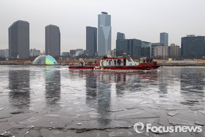 (서울=포커스뉴스) 절기상 '대한' 이며 한강이 공식 결빙된 것으로 발표된 21일 오전 서울 영등포구 여의도동 한강에서 119 특수구조단 수난구조대 대원들이 수난구조정을 동원해 쇄빙작업을 하고 있다. 한강 결빙 관측은 한강대교 노량진 방향 2번째와 4번째 교각 사이에서 이루어지며 상류 쪽으로 100m 부근의 남북 간 띠 모양 지점이 얼었는지에 따라 결빙 여부를 판정한다.