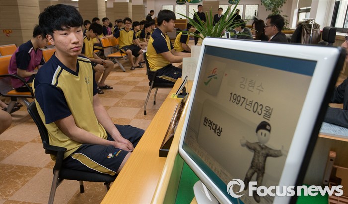 (서울=포커스뉴스) 2016년 첫 징병검사가 실시된 21일 오전 서울 영등포구 서울지방병무청에서 올해 첫 현역판정을 받은 김현수 씨가 현역 대상임을 통보받고 있다.