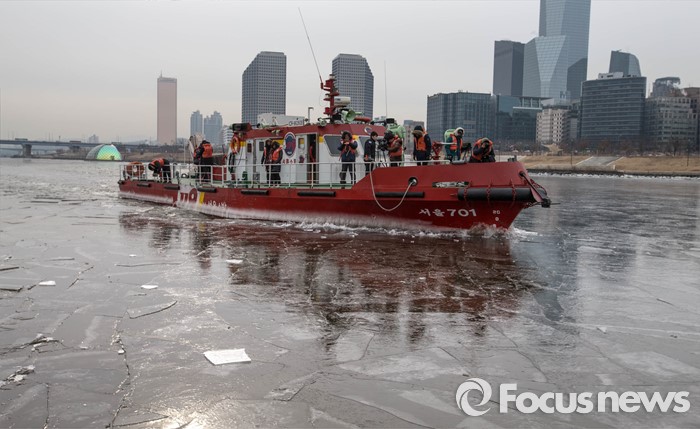 (서울=포커스뉴스) 절기상 '대한' 이며 한강이 공식 결빙된 것으로 발표된 21일 오전 서울 영등포구 여의도동 한강에서 119 특수구조단 수난구조대 대원들이 수난구조정을 동원해 쇄빙작업을 하고 있다. 한강 결빙 관측은 한강대교 노량진 방향 2번째와 4번째 교각 사이에서 이루어지며 상류 쪽으로 100m 부근의 남북 간 띠 모양 지점이 얼었는지에 따라 결빙 여부를 판정한다.