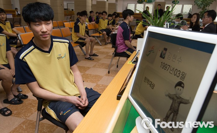 (서울=포커스뉴스) 2016년 첫 징병검사가 실시된 21일 오전 서울 영등포구 서울지방병무청에서 올해 첫 현역판정을 받은 김현수 씨가 현역 대상임을 통보받고 있다.