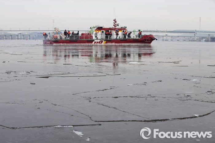 (서울=포커스뉴스) 절기상 '대한' 이며 한강이 공식 결빙된 것으로 발표된 21일 오전 서울 영등포구 여의도동 한강에서 119 특수구조단 수난구조대 대원들이 수난구조정을 동원, 쇄빙작업을 하고 있다. 한강 결빙 관측은 한강대교 노량진 방향 2번째와 4번째 교각 사이에서 이루어지며 상류 쪽으로 100m 부근의 남북 간 띠 모양 지점이 얼었는지에 따라 결빙 여부를 판정한다.