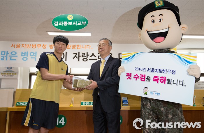 (서울=포커스뉴스) 2016년 첫 징병검사가 실시된 21일 오전 서울 영등포구 서울지방병무청에서 올해 첫 현역판정을 받은 김현수 씨가 이상진 서울지방병무청장과 기념촬영을 하고 있다.