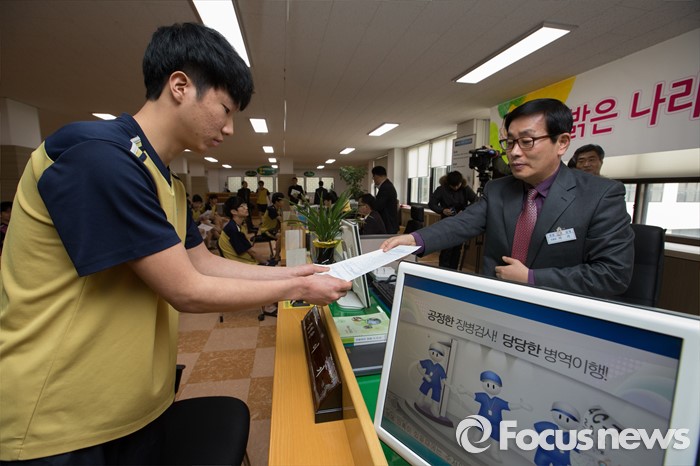 (서울=포커스뉴스) 2016년 첫 징병검사가 실시된 21일 오전 서울 영등포구 서울지방병무청에서 올해 첫 현역판정을 받은 김현수 씨가 신체검사결과통보서를 받고 있다.