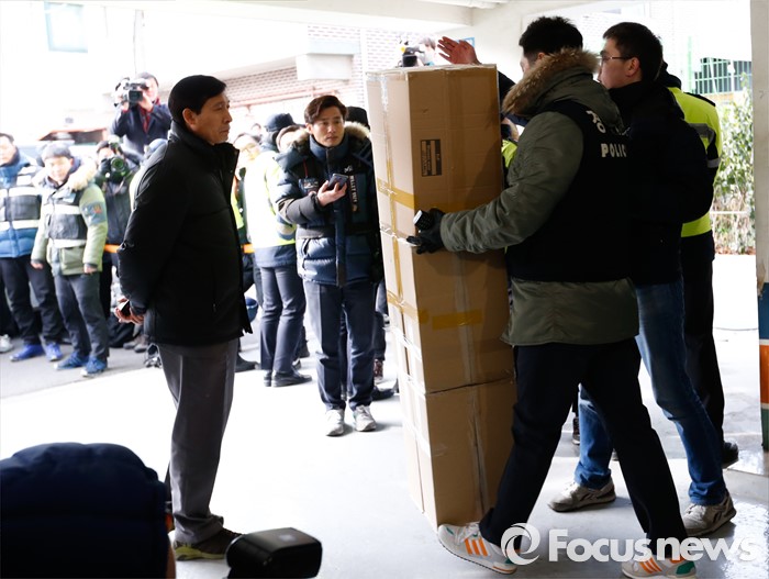 (부천=포커스뉴스) 부천 초등생 살해사건의 두번째 현장검증이 실시된 21일 오전 피의자의 전 거주지로 알려진 부천 원미구 한 빌라에서 경찰이 시신을 유기한 냉장고로 재연된 종이 상자를 옮기고 있다.