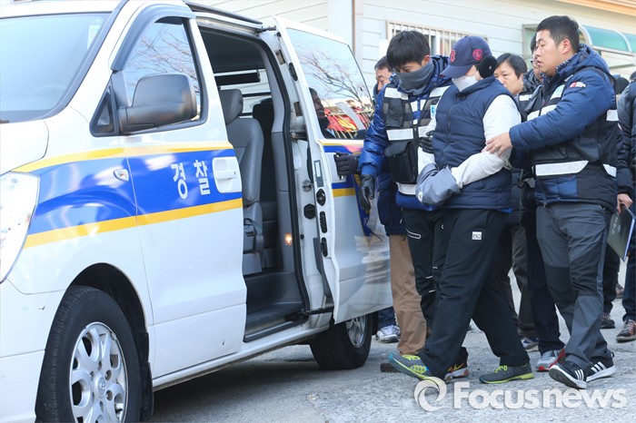 | △ 호송차 타기 위해 이동하는 피의자 최모 씨 |