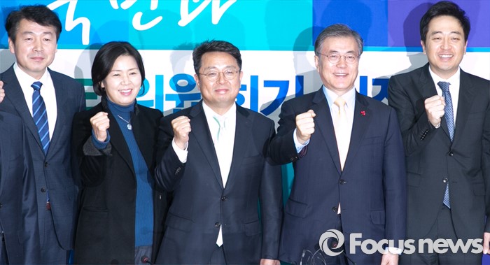 아울러 "인물 영입, 세대 및 세력교체, 어젠더 제시, 조직과 시스템 개편, 담론 개발, 문화 혁신, 연대정치, 선거캠페인 등이 우리의 과제다"며 "더민주를 새롭게 해 우리 정치를 바꾸는 일을 멋지게, 즐겁게, 힘차게 해보겠다. 부정과 배제보다는 긍정과 배려의 자세로 임하겠다"고 말했다.21일 오전 서울 여의도 국회에서 열린 더불어민주당 뉴파티특별위원회 출범 회의에 앞서 기동민(왼쪽부터) 전 서울시 정무부시장, 양향자 전 삼성전자 상무, 이철희 두문정치전략연구소장, 문재인 대표, 금태섭 변호사가 취재진을 향해 포즈를 취하고 있다. 2016.01.21 박동욱 기자