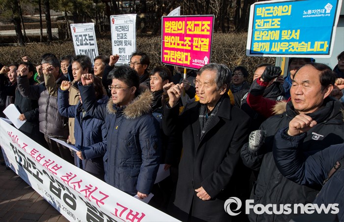 (서울=포커스뉴스) 21일 오후 서울 서초구 서울중앙지방법원 인근에서 열린 법외노조 통보처분 취소청구 고법 판결에 대한 전교조 입장 발표 기자회견에서 변성호 전국교직원노동조합 위원장 및 노조원들이 구호를 외치고 있다.
