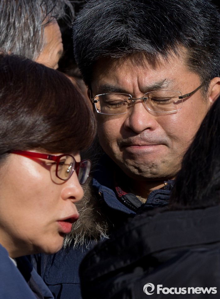 (서울=포커스뉴스) 21일 오후 서울 서초구 서울중앙지방법원 인근에서 열린 법외노조 통보처분 취소청구 고법 판결에 대한 전교조 입장 발표 기자회견에서 변성호 전국교직원노동조합 위원장이 굳은 표정을 짓고 있다.