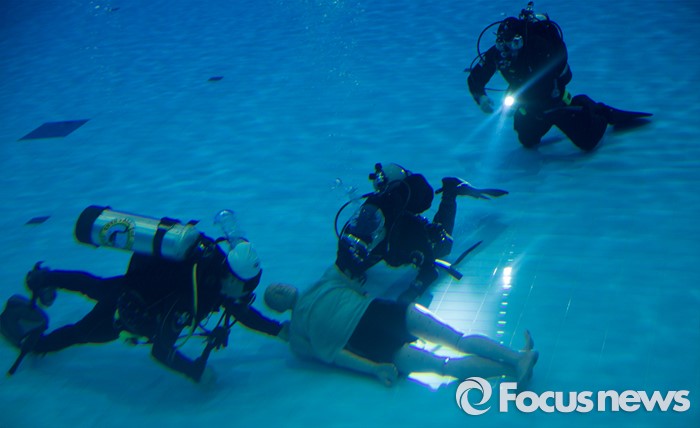 (대전=포커스뉴스) 21일 오후 대전 동구 용운국제수영장에서 충북 영동소방서 구조대원들이 동계 수난사고 인명구조훈련을 실시하고 있다.