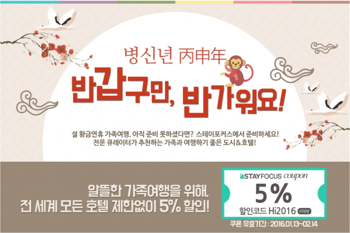 (서울=포커스뉴스) 호텔 예약서비스 제공업체 스테이포커스가 설 연휴 해외여행 여행객들에게 할인이벤트를 펼친다. 스테이포커스 회원이라면 홈페이지에서 다운로드한 할인쿠폰코드로 다음달 14일까지 호텔 예약 결제 시 5% 추가할인을 해준다. 신규 가입자에게는 1만원 할인혜택을 제공한다.스테이포커스 '5% 추가할인 쿠폰 제공 이벤트' 포스터. <사진제공=스테이포커스>