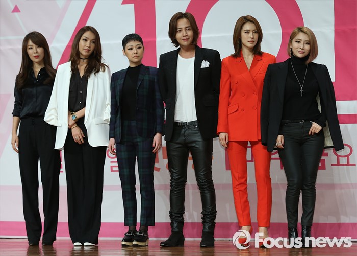 (서울=포커스뉴스) 21일 오후 서울 영등포구 63스퀘어에서 열린 Mnet '프로듀스 101' 제작발표회에 참석한 보컬트레이너 김성은(왼쪽부터), 안무가 배윤정, 래퍼 치타, 배우 장근석, 가수 가희, 제아가 포토타임을 갖고 있다.