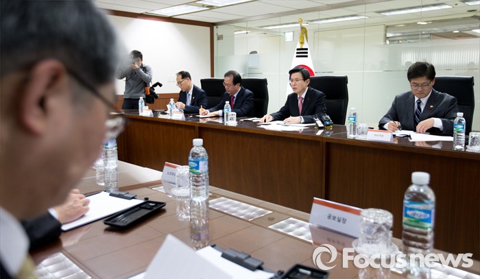 (서울=포커스뉴스) 21일 오후 서울 중구 한화 본사를 방문한 황교안 국무총리가 노동개혁과 관련해 현장 노사와의 대화 시간을 갖고 있다.