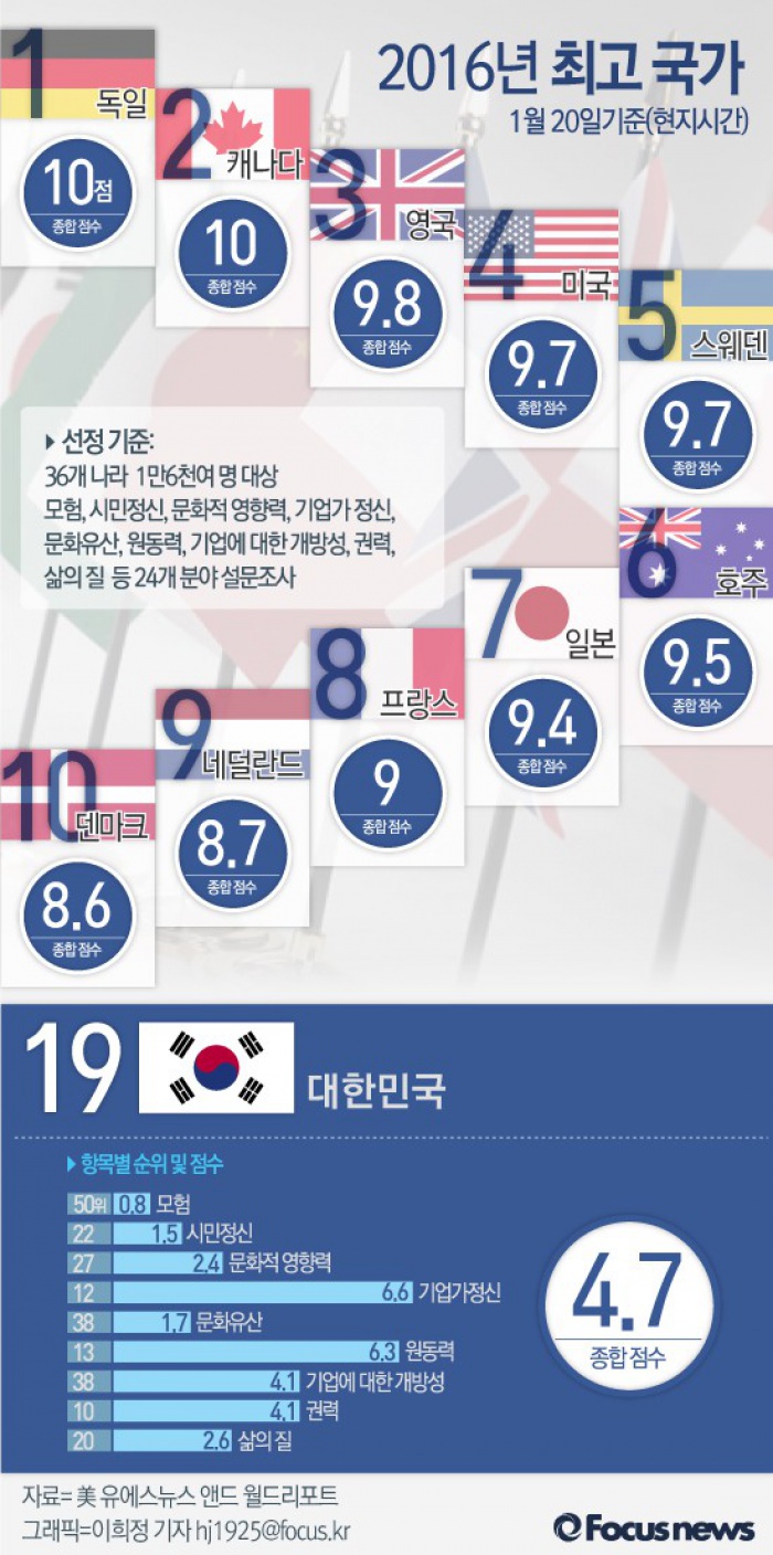 (서울=포커스뉴스) 미국 시사주간지 ‘유에스뉴스 앤드 월드리포트(USNWR)’가 여론조사 전문기관들의 도움을 받아 작성해 최신호에 발표한 ‘2016년 최고 국가’ 순위에서 한국은 전체 조사대상 60개국 가운데 19위를 기록했다.