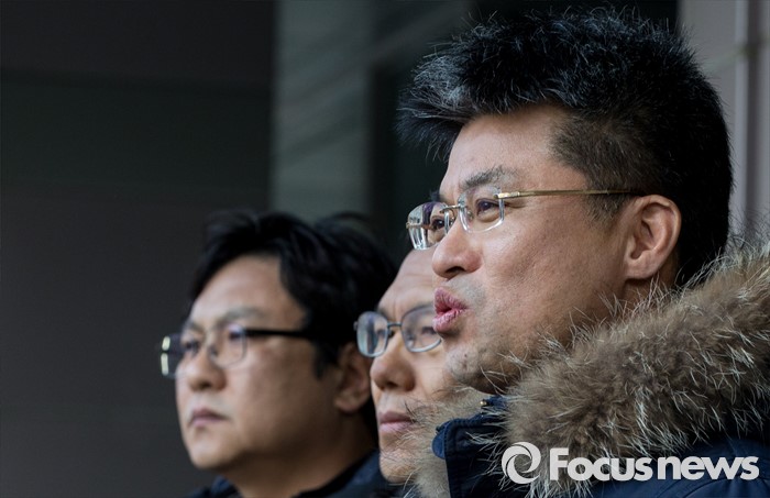 (서울=포커스뉴스) 21일 오후 서울 서초구 서울고등법원 별관에서 열린 법외노조 통보처분 취소소송 항소심을 마친 변성호 전국교직원노동조합 위원장이 취재진을 향해 입장을 밝히고 있다.