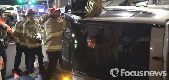(서울=포커스뉴스) 20일 오후 11시 50분쯤 서울 중랑구 면목동 중화중학교 앞 삼거리에서 조모(38)씨가 몰던 SUV차량이 마주오던 택시를 들이받고 전복되는 사고가 발생했다.