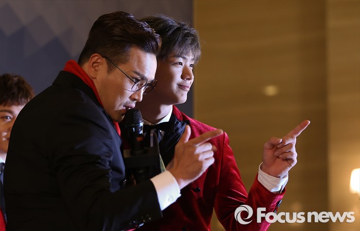 (서울=포커스뉴스) 21일 서울 동대문구 경희대학교 평화의 전당에서 열린 제 30회 골든디스크 시상식에 레드카펫 진행자 딩동(왼쪽)과 비투비의 멤버 육성재가 포토타임을 갖고 있다.