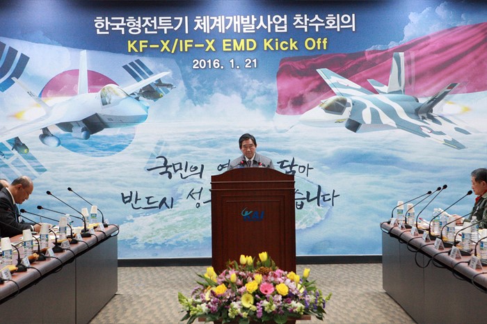 (서울=포커스뉴스) 21일 경남 사천 한국항공우주산업(KAI) 항공기개발센터에서 열린 '한국형 전투기(KF-X) 체계개발사업 착수회의'에서 하성용 사장이 환영사를 하고 있다. <사진제공=한국항공우주산업>
