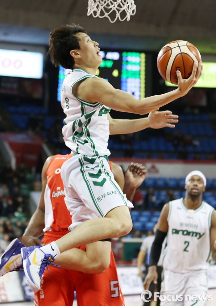 (서울=포커스뉴스) 21일 서울 잠실학생체육관에서 열린 2015-2016 프로농구 SK-동부 경기에서 동부 허웅이 골밑 돌파후 리버스 레이업슛을 시도하고 있다.