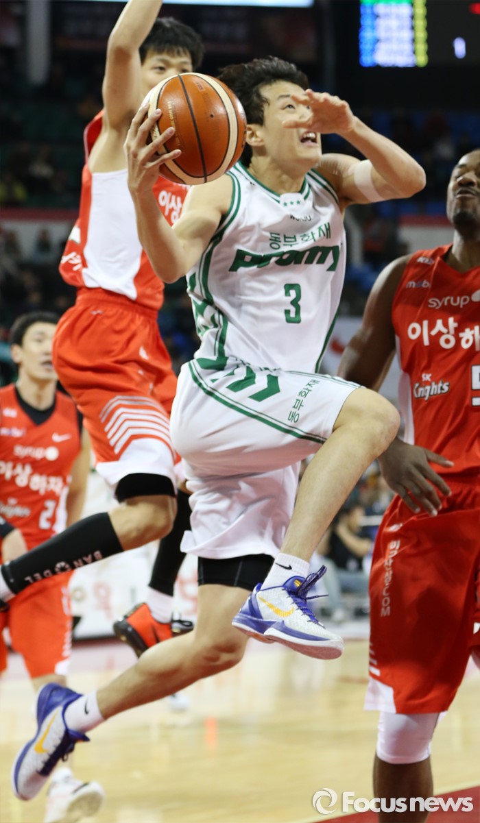 (서울=포커스뉴스) 21일 서울 잠실학생체육관에서 열린 2015-2016 프로농구 SK-동부 경기에서 동부 허웅이 골밑을 돌파하며 레이업슛을 시도하고 있다.