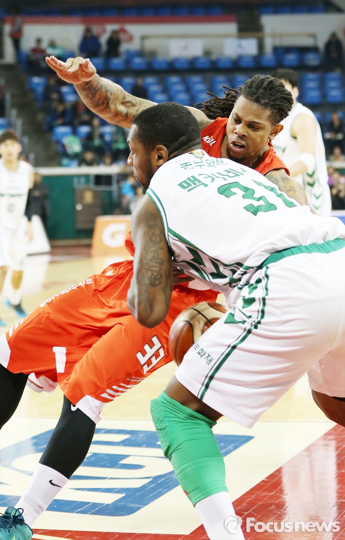 (서울=포커스뉴스) 21일 서울 잠실학생체육관에서 열린 2015-2016 프로농구 SK-동부 경기에서 SK의 새로운 외국인 선수 미첼과 동부 맥키네스가 치열한 볼다툼을 하고 있다.