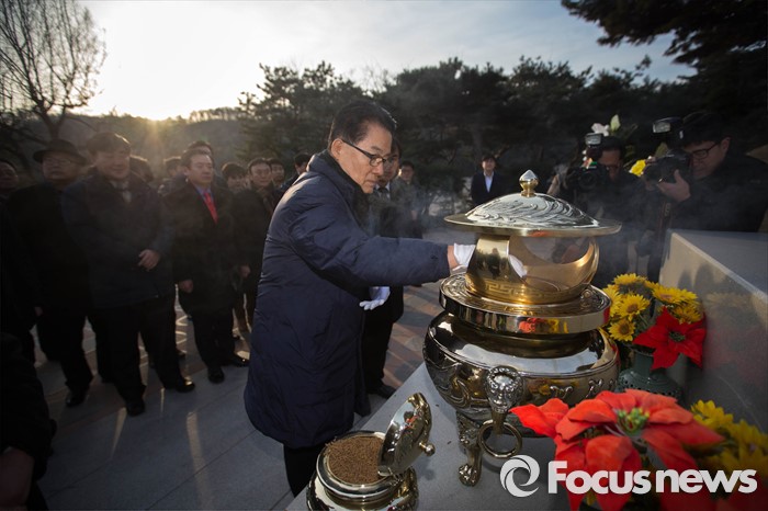(서울=포커스뉴스) 더불어민주당 탈당을 예고한 박지원 전 원내대표가 22일 오전 서울 동작구 국립서울현충원 故 김대중 전 대통령 묘역을 방문해 참배를 하고 있다