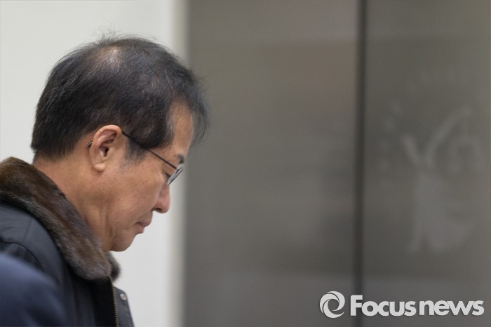 (서울=포커스뉴스) 고 성완종 전 경남기업 회장에게서 불법정치자금을 받은 혐의로 기소된 홍준표 경남지사가 22일 오전 서울 서초구 서울중앙지방법원에서 열린 2차 공판에 출석하기 위해 들어서 승강기에 탑승하고 있다.